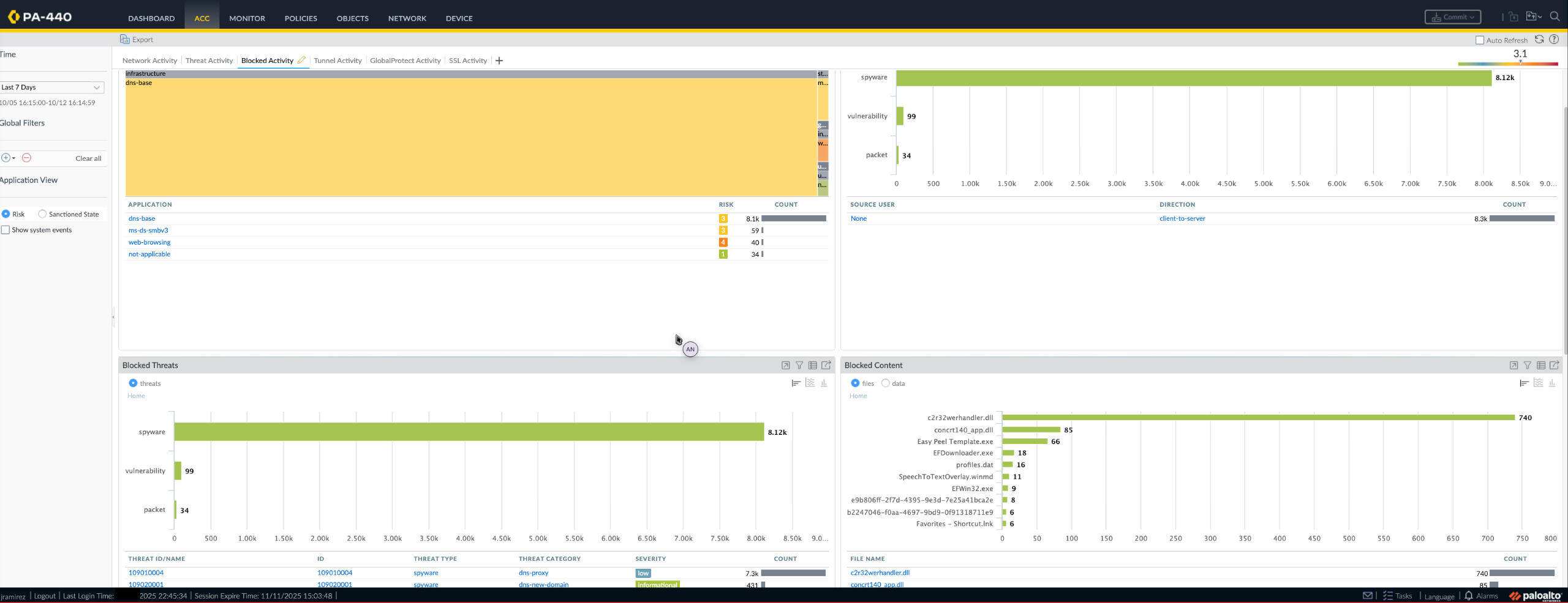 Used the Application Command Center (ACC) to visualize detections by threat type (Spyware, Vulnerability, Packet).